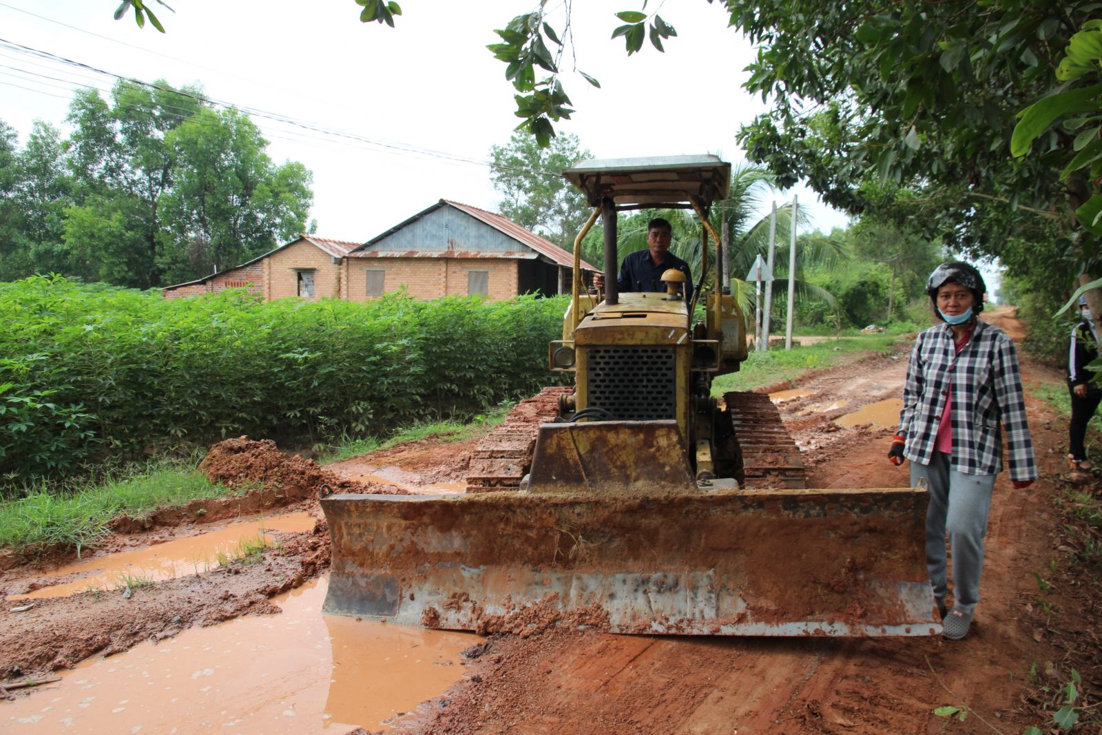 Chị Nghiêm giám sát việc thi công đường ở ấp.