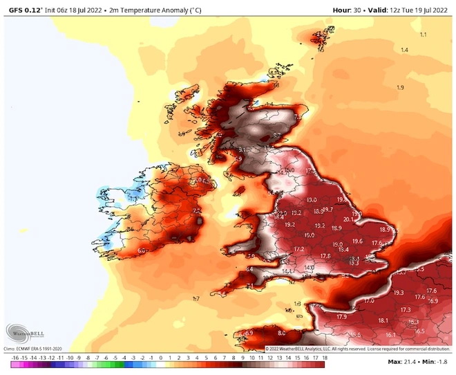 Nhiệt độ trong 2 ngày 18 và 19/7 ở Anh. Ảnh: WeatherBell.