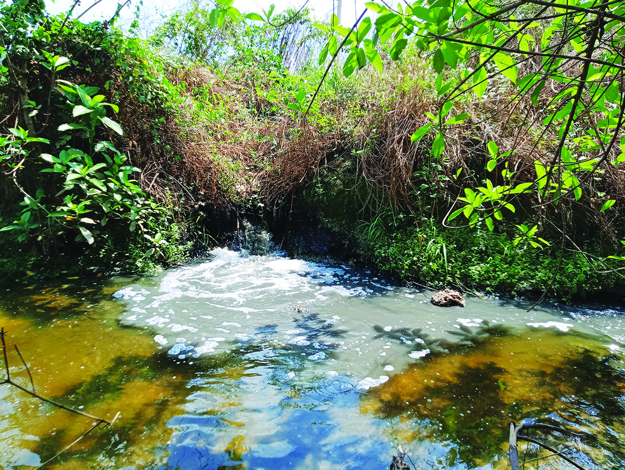 Nước thải từ cống đổ xuống mương với lưu lượng khá lớn, nước có màu đen, nhiều bọt khí, bốc mùi hôi. Lần theo mương trên qua nhiều diện tích đất nông nghiệp, nguồn nước trong mương hợp dòng cùng suối Tà Ôn (theo cách gọi của người dân địa phương). Suối này dẫn nước về hướng hạ lưu và thông dòng chảy với suối Bà Chiêm tại khu vực bến đò Cửu Long, thuộc địa phận xã Tân Thành.