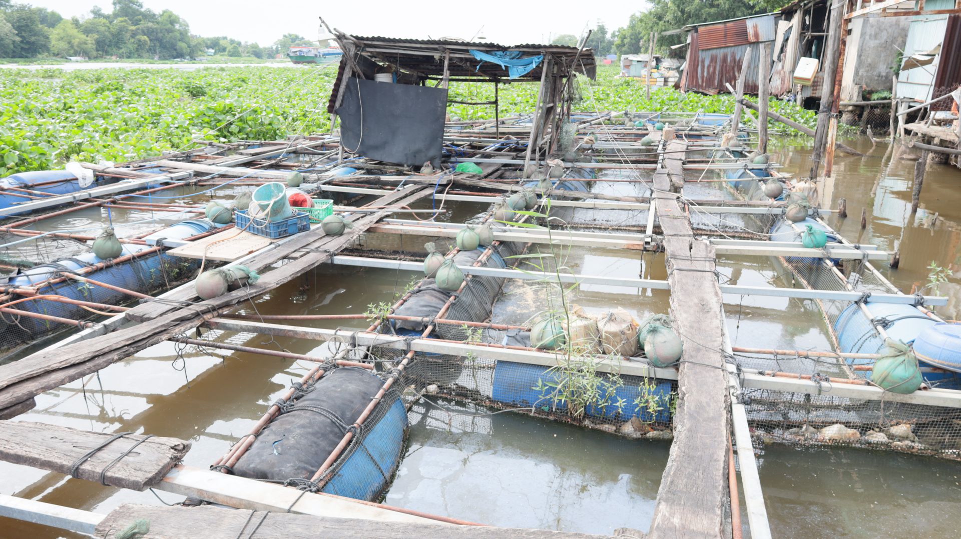 Bè cá nuôi của gia đình bà Huỳnh Thị Phương Nam trống không.