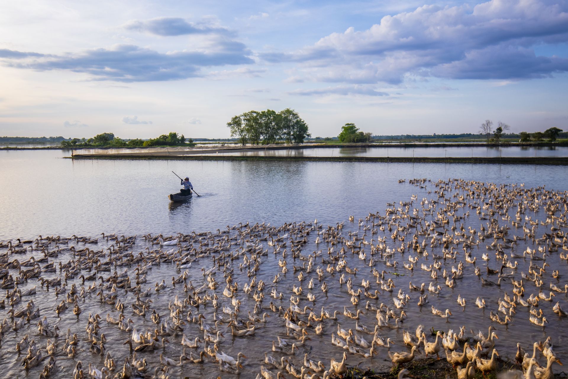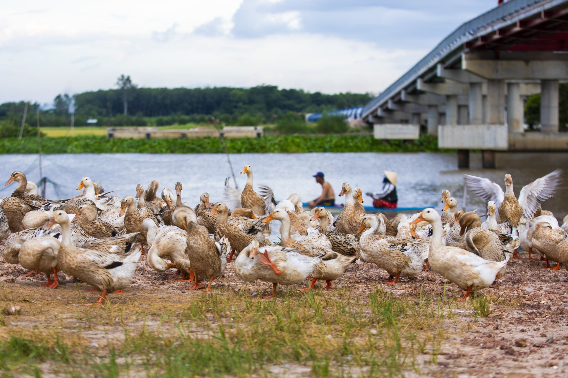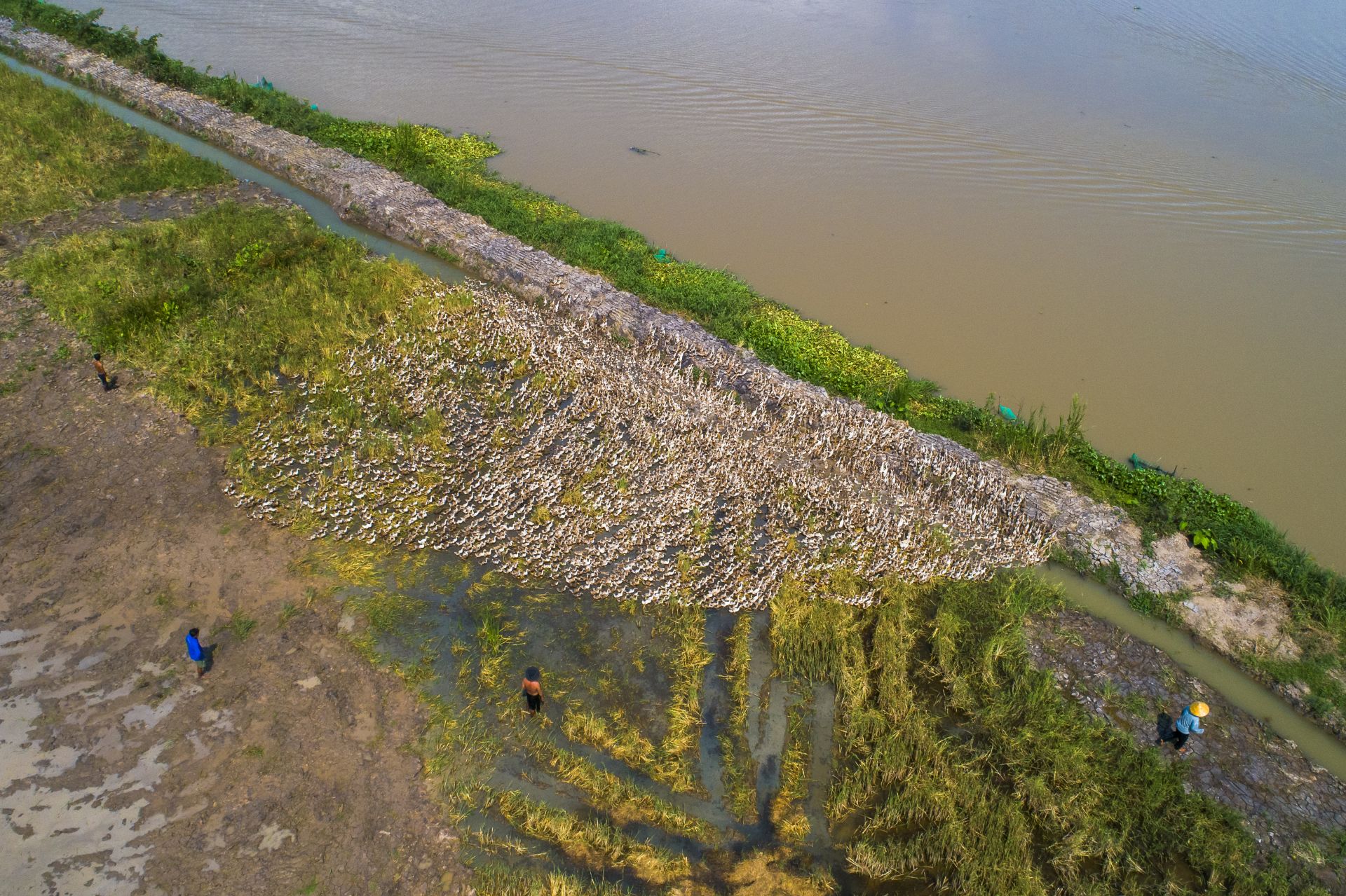 Đàn vịt thảnh thơi nghỉ ngơi bên dòng sông Vàm Cỏ.