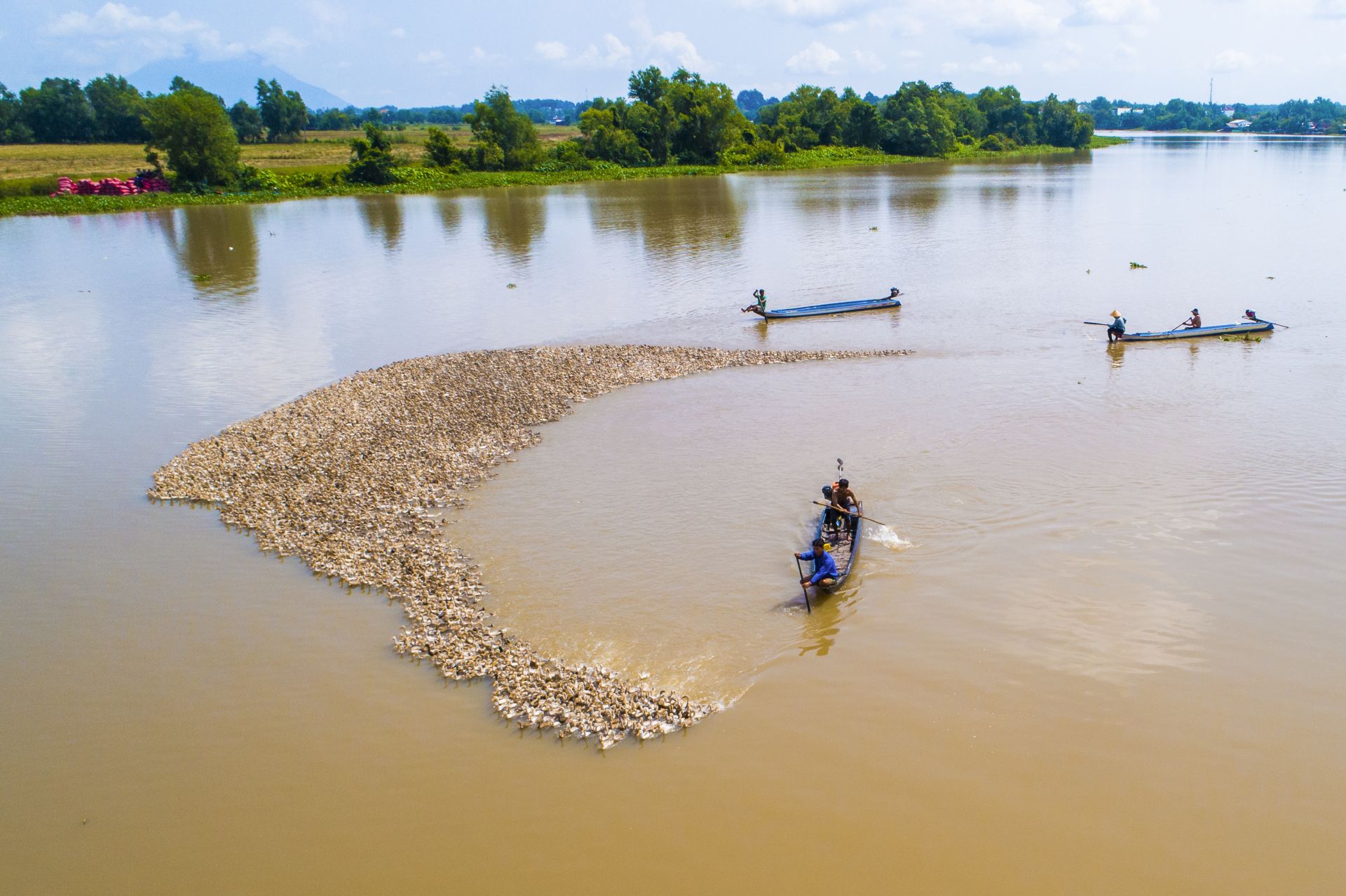 Đàn vịt của gia đình anh Sương thong thả tắm mình trên dòng sông Vàm Cỏ.