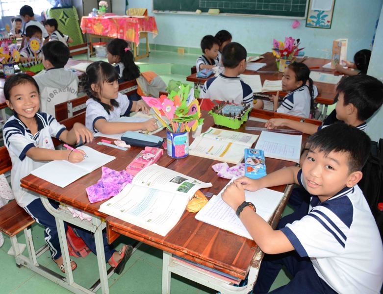 Học sinh Trường tiểu học Thị trấn A trong giờ học ở lớp.
