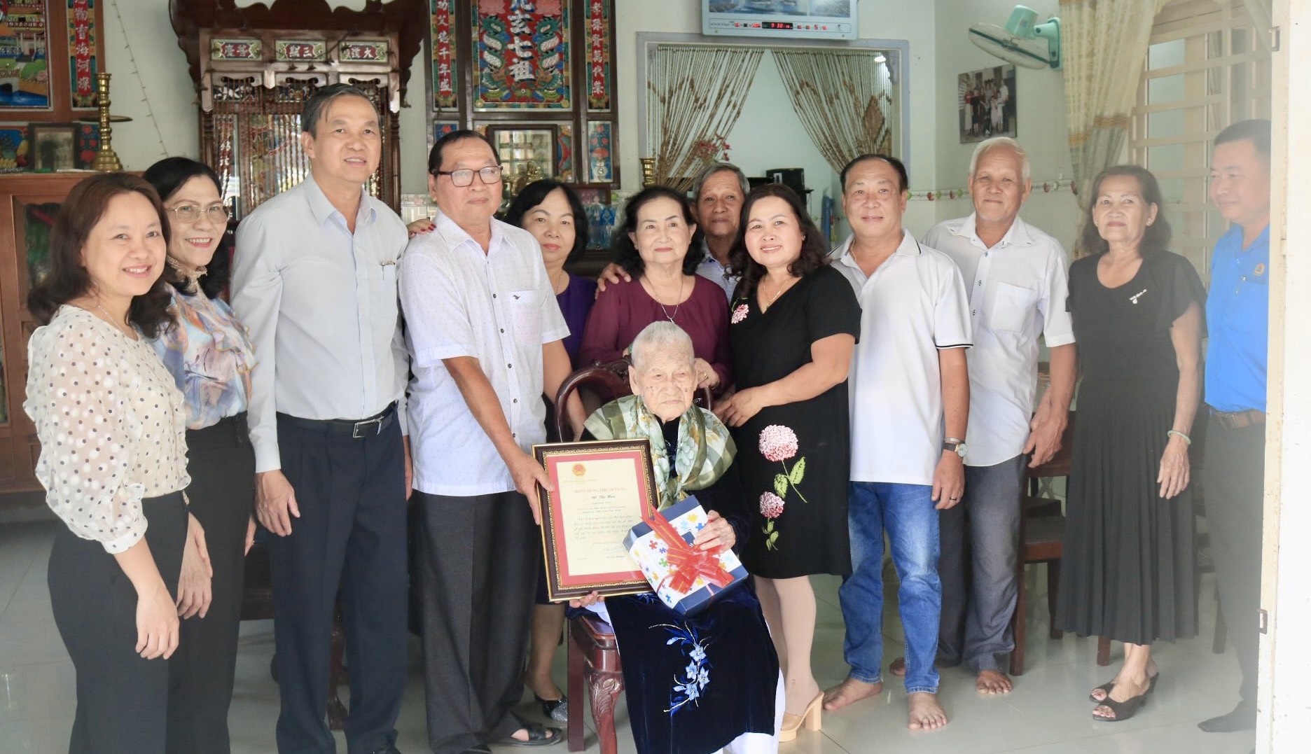 Ông Dương Văn Thắng- Phó Chủ tịch UBND tỉnh (thứ 3 từ trái qua) cùng đoàn công tác thăm, tặng quà cho bà Đỗ Thị Hoa, công dân tròn 100 tuổi.