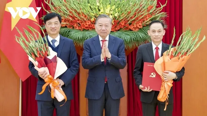 Tổng Bí thư Tô Lâm tặng hoa chúc mừng ông Nguyễn Duy Ngọc đã hoàn thành xuất sắc cương vị Chánh Văn phòng Trung ương Đảng; trao các quyết định về chức năng, nhiệm vụ, tổ chức bộ máy của Văn phòng Trung ương Đảng và chúc mừng ông Lê Hoài Trung (bên phải).
