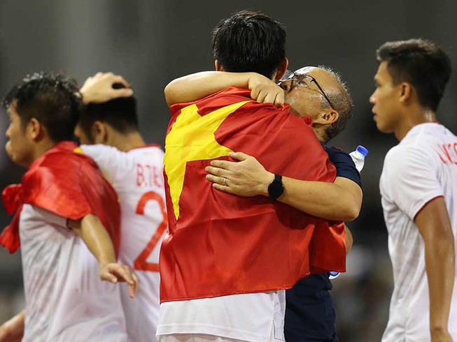 Nụ hôn cám ơn học trò cưng Đoàn Văn Hậu sau chiếc HCV SEA Games rồi thầy trò chia tay để Hậu về Hà Lan. Ảnh: ANH PHƯƠNG