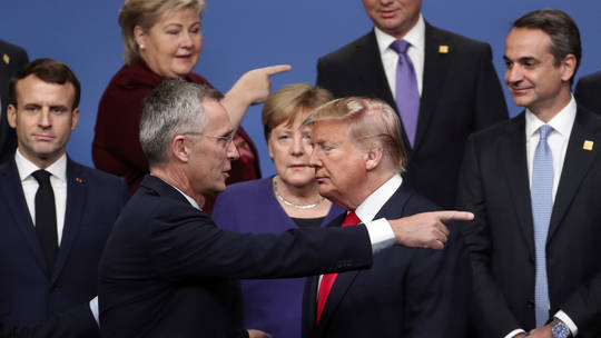 Ông Donald Trump và Tổng thư ký NATO Jens Stoltenberg sau màn chụp ảnh chung của các nhà lãnh đạo NATO ở Watford, Anh, ngày 4/12/2019. Ảnh: AP