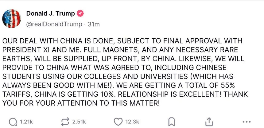 Tổng thống Mỹ Donald Trump đã đăng bài viết thông báo thỏa thuận với Trung Quốc "đã hoàn tất" trên mạng xã hội Truth Social.