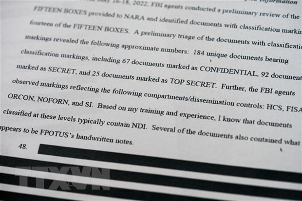 Các tài liệu thu thập được trong quá trình khám xét dinh thự Mar-a-Lago của cựu Tổng thống Mỹ Donald Trump ở Palm Beach, Florida (Mỹ) ngày 26/8/2022. (Ảnh: THX/TTXVN)