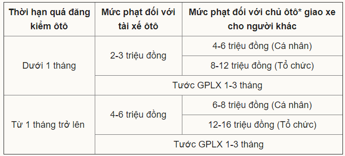 Có hai mức phạt cho tài xế và chủ xe giao ôtô cho người khác điều khiển tùy thuộc vào thời gian quá hạn đăng kiểm của ôtô dưới 1 tháng hay từ 1 tháng trở lên: