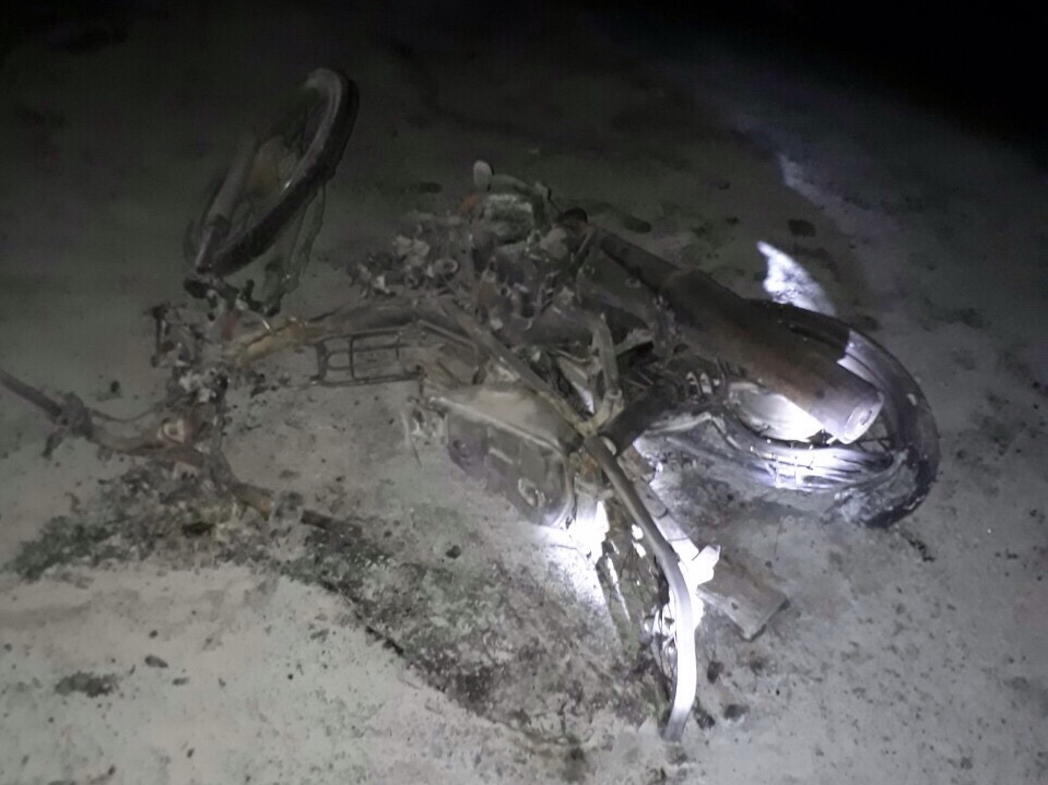 Hiện trường vụ TNGT, xe môtô bị cháy rụi. |