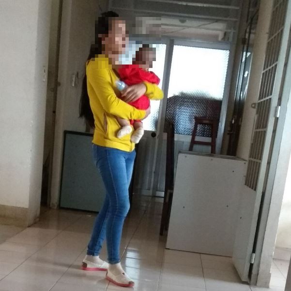 Vợ bị cáo V.P bồng con nhỏ đứng ngoài hàng lang phòng xét xử dõi mắt theo dõi phiên toà bên trong.