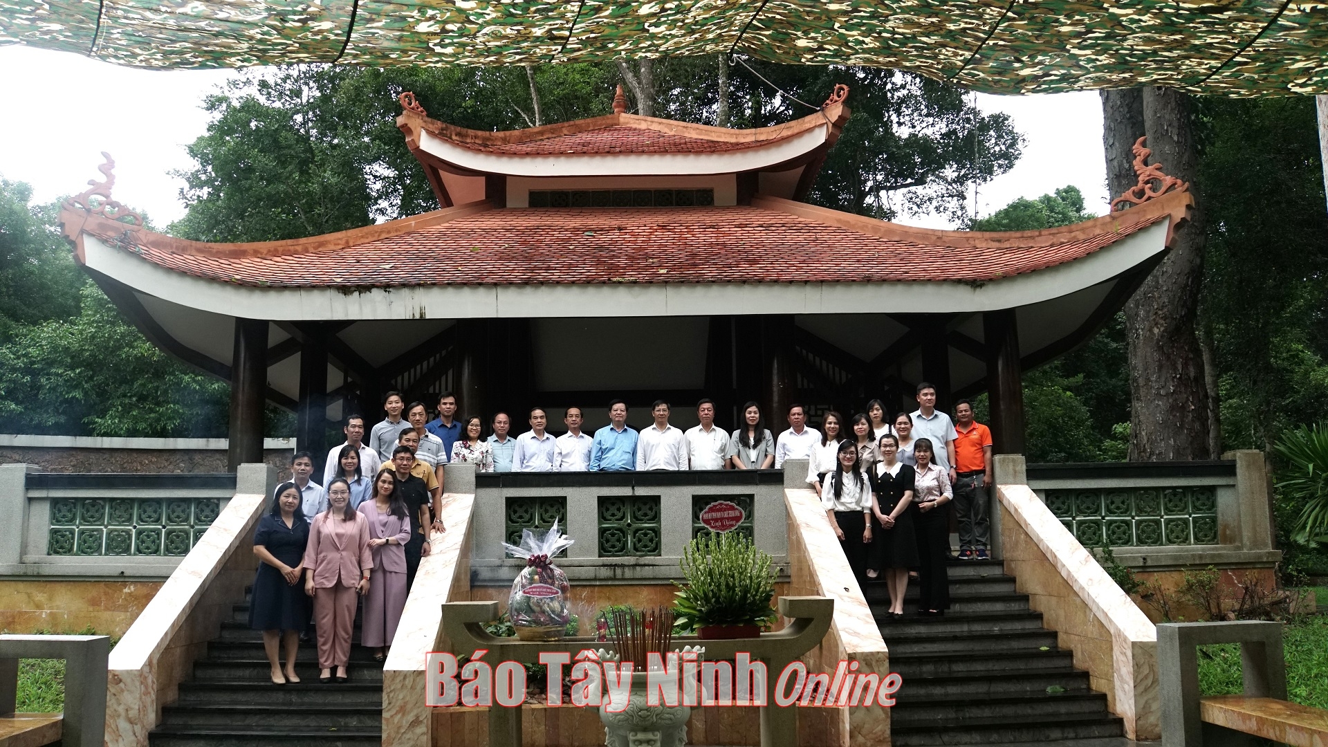 Đoàn công tác của Ban Tổ chức Trung ương và lãnh đạo Tỉnh uỷ chụp ảnh lưu niệm tại Khu di tích lịch sử Ban Tổ chức Trung ương Cục miền Nam. Ảnh: Phương Thuý