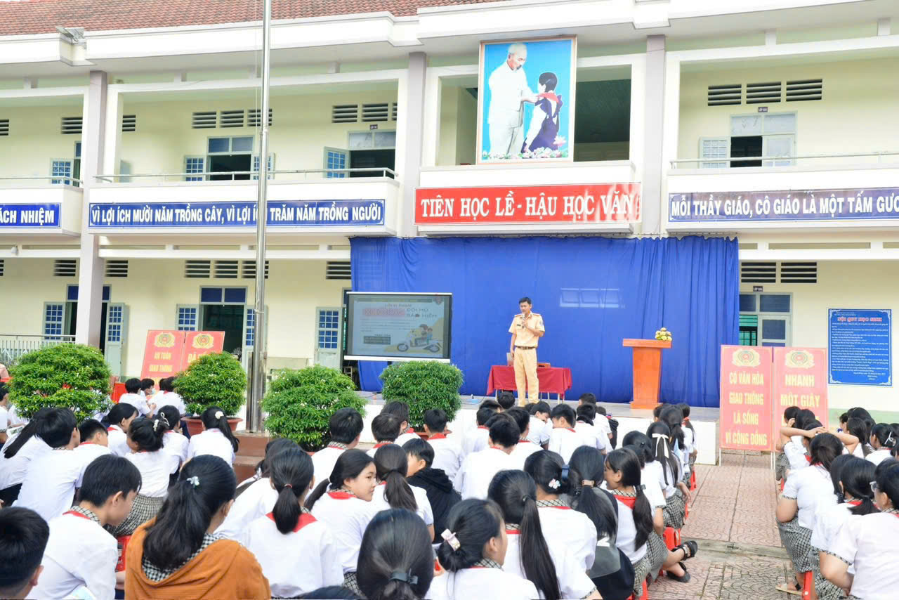 Cảnh sát giao thông tuyên truyền pháp luật về ATGT cho học sinh.