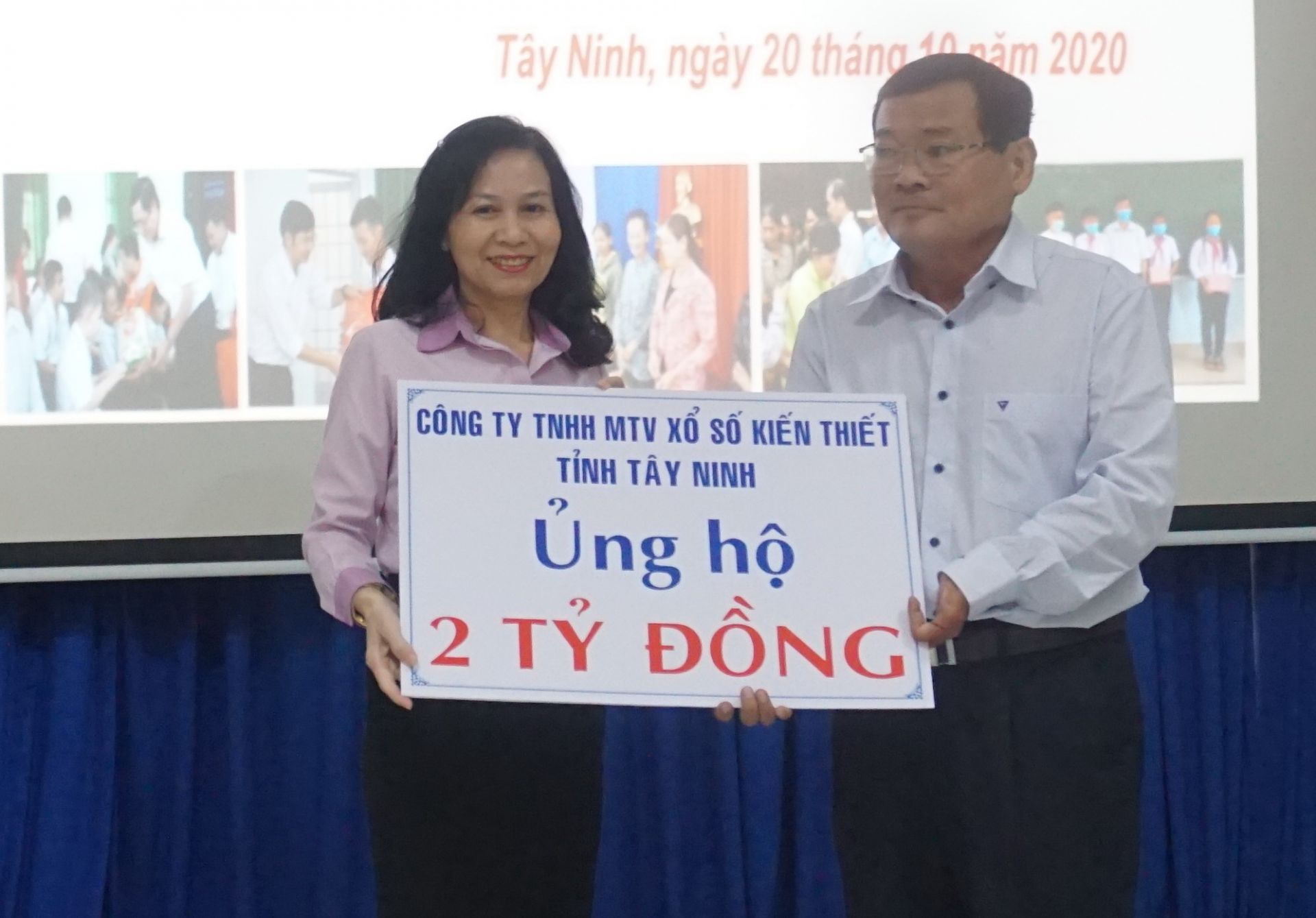 Lãnh đạo UB.MTTQVN tỉnh (phải ) tiếp nhận ủng hộ.
