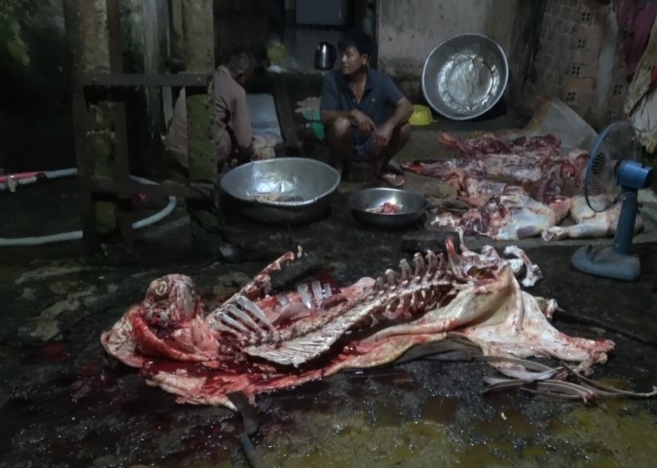 Vào khoảng 2 giờ sáng ngày 1.8, Phòng Cảnh sát môi trường Công an Tây Ninh chủ trì phối hợp với Chi cục Thú y tỉnh kiểm tra điểm giết mổ bò tại ấp 3, xã Phước Vinh do ông Lê Văn Mơi (SN 1972, ngụ xã Phước Vinh, huyện Châu Thành) làm chủ.