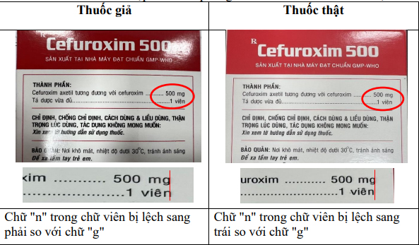 Hình ảnh phân biệt giữa thuốc Cefuroxim 500mg giả và thuốc thật.