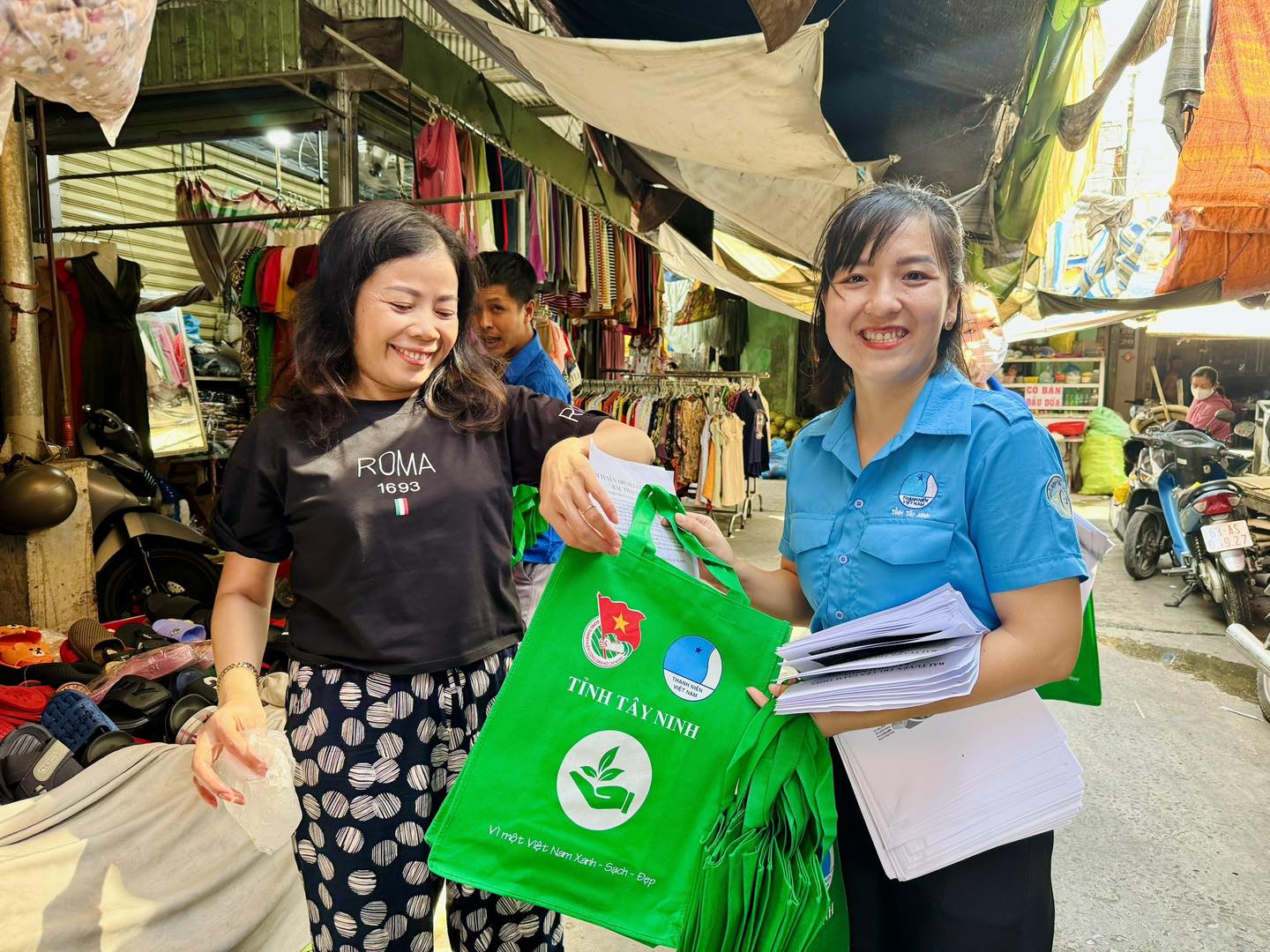 Các cơ sở đoàn phát túi hữu cơ tự phân huỷ cho người dân trong mô hình “Chợ dân sinh giảm thiểu rác thải nhựa”.