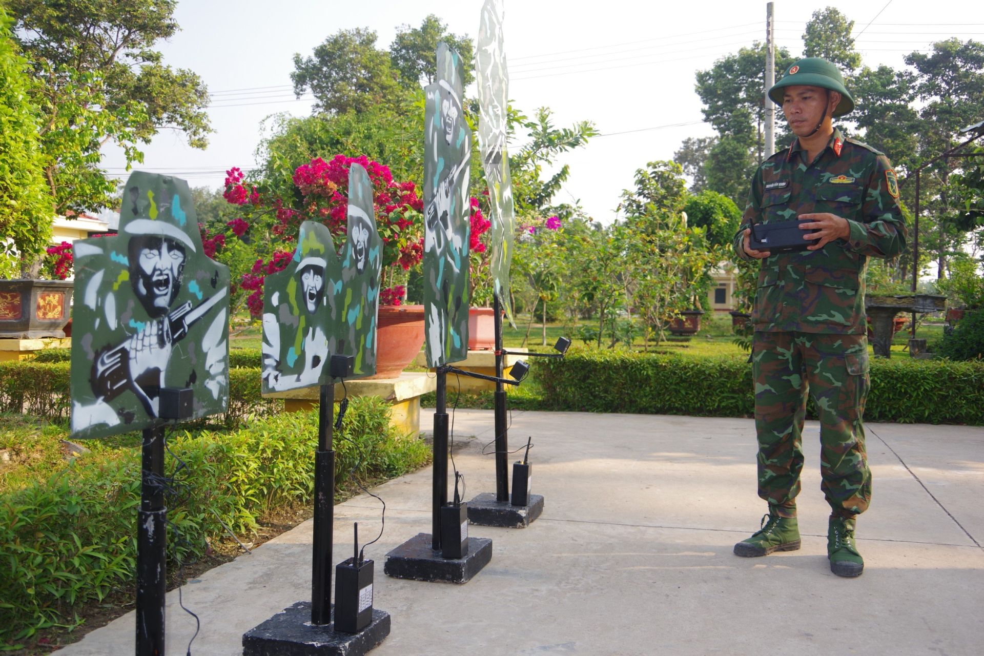 Đại uý Nguyễn Văn Khơn thao tác sử dụng sáng kiến của mình.
