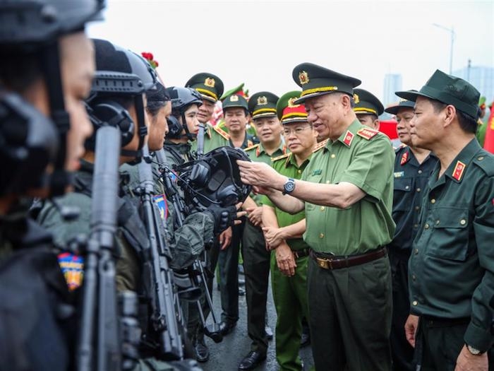 Bộ trưởng Bộ Công an Tô Lâm thăm, động viên cán bộ, chiến sĩ Bộ Tư lệnh CSCĐ tập luyện. Ảnh: TL.