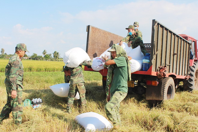 CBCS Trung đoàn Bộ binh 174 giúp nhân dân thu hoạch lúa trước khi có mưa.