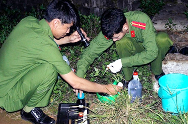 Cơ quan chức năng lấy mẫu kiểm nghiệm nước xả thải của một công ty tại TP Bảo Lộc. (Ảnh minh họa)