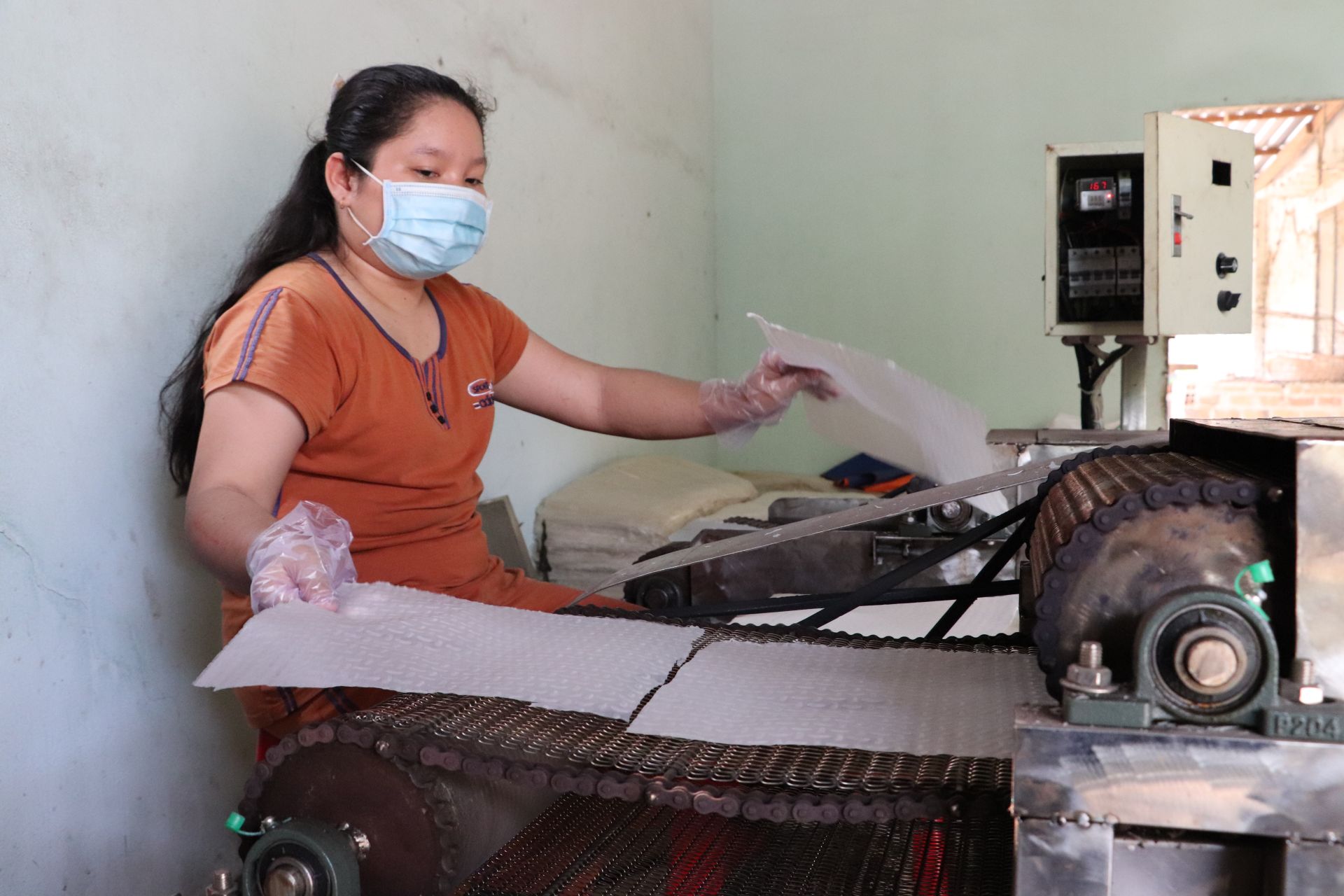 Sản xuất bánh tráng bằng máy tại một cơ sở ở thị xã Trảng Bàng.
