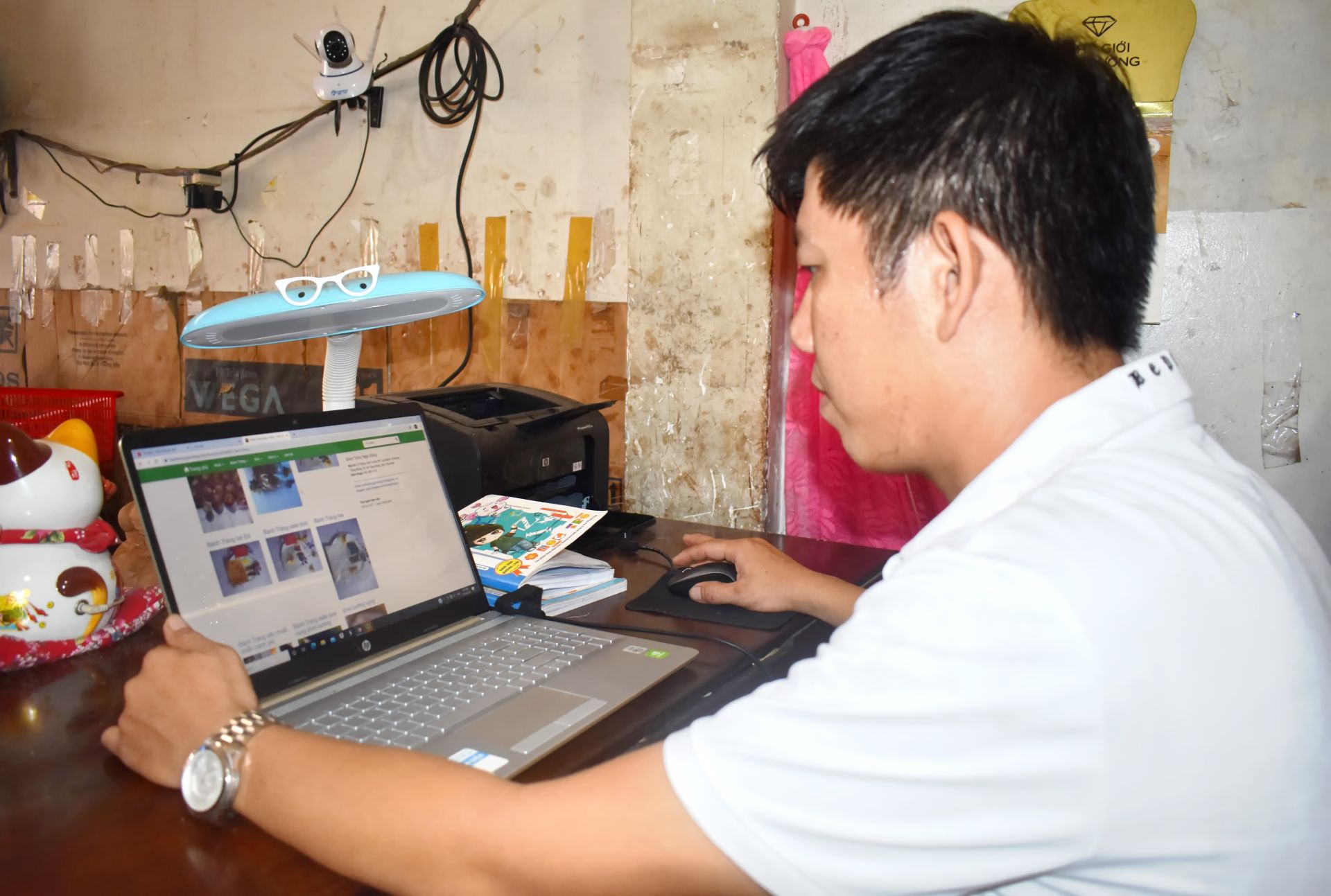 Anh Chiêm Ngọc Tuyển- chủ cơ sở sản xuất bánh tráng muối tôm Ngọc Ðăng kiểm tra hàng hoá được bán trên các trang TMÐT.
