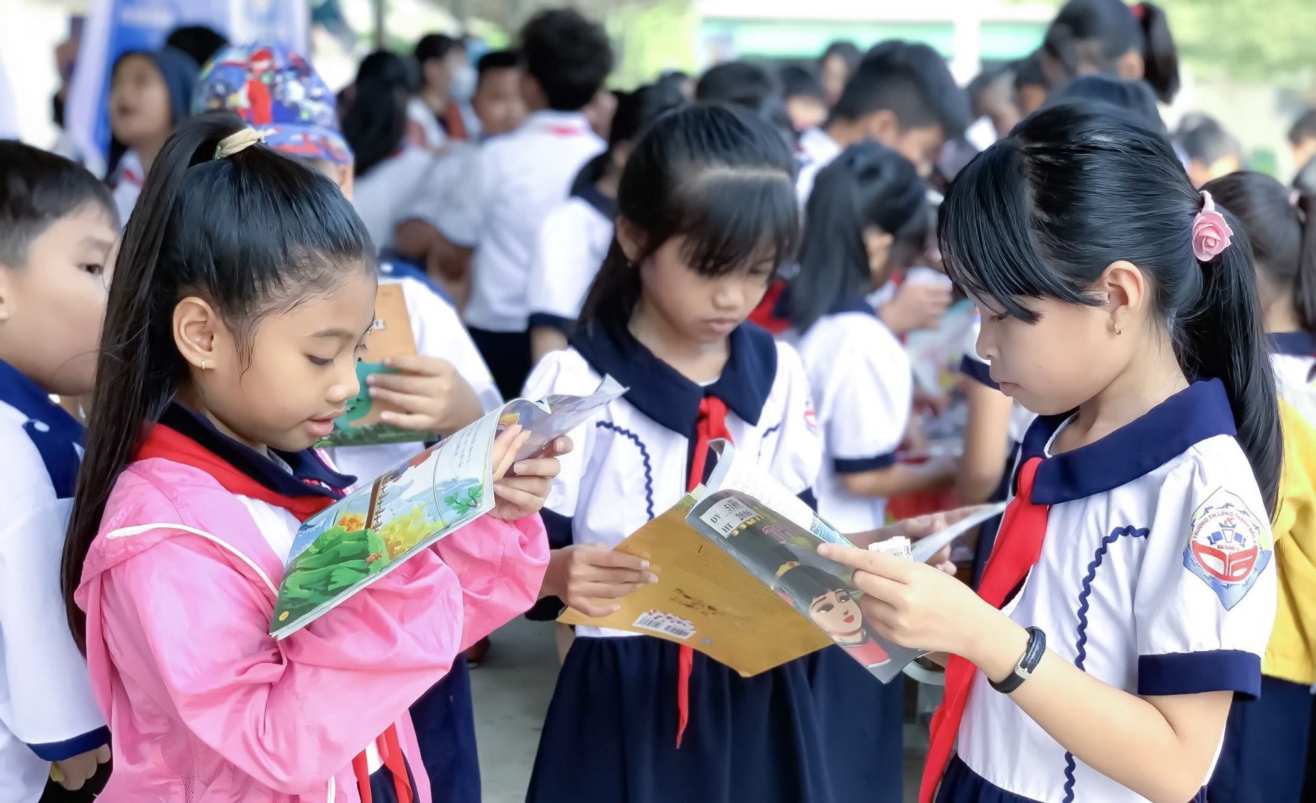 Các bạn đoàn viên, thiếu nhi đọc sách tại thư viện Trường tiểu học Trường Hoà B, thị xã Hoà Thành.