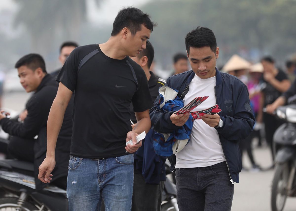 Vé được LĐBĐ Việt Nam (VFF) mở bán tại quầy ở sân Mỹ Đình từ sáng nay, Chủ nhật 11/11. Nhưng không phải CĐV nào cũng có thời gian và sự kiên nhẫn để xếp hàng từ đêm lấy chỗ vào mua vé. Đây là cơ hội để dân phe vé tung hoành ở khu vực quảng trường trước sân Mỹ Đình khi nhiều người hâm mộ tìm đến mua lại.