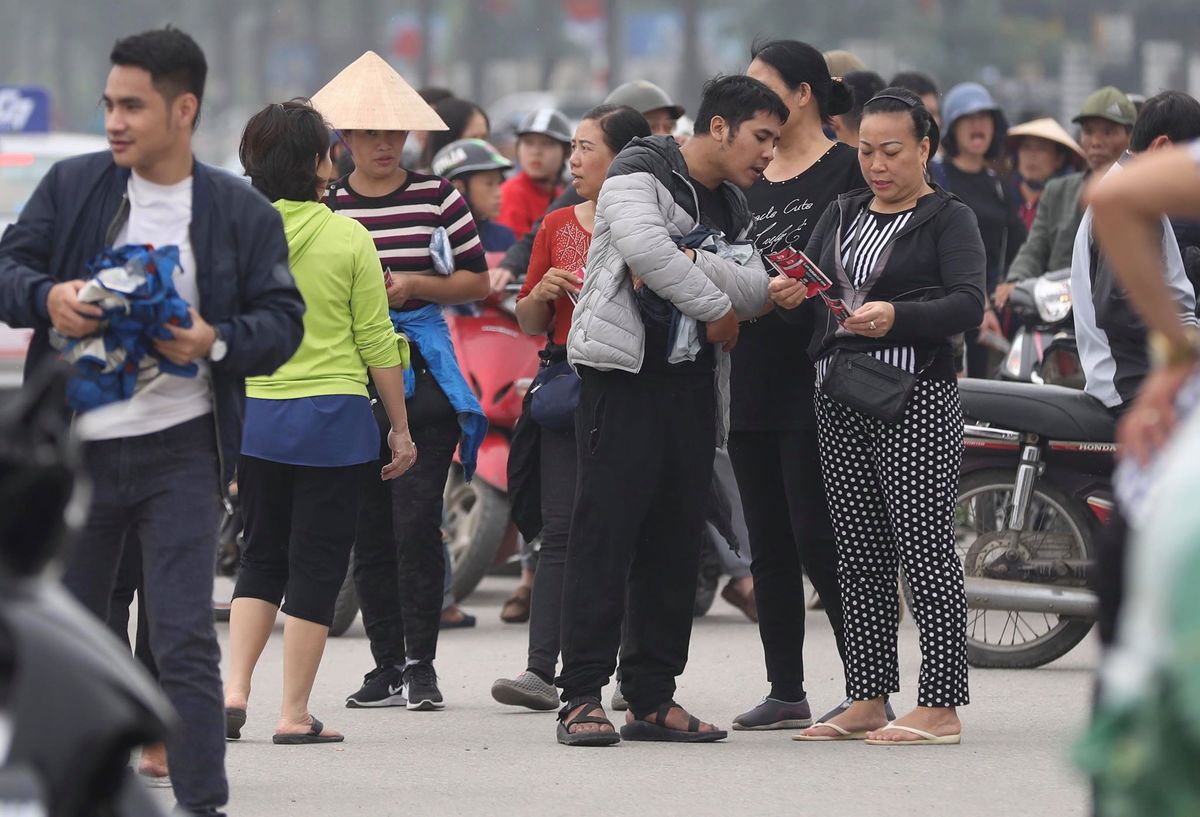 Chợ vé bắt đầu tấp nập từ khoảng hơn 10h, thời điểm các dân phe thu mua xong vé từ dòng người xếp hàng và dồn ra bên ngoài cổng sân Mỹ Đình để bán lại.