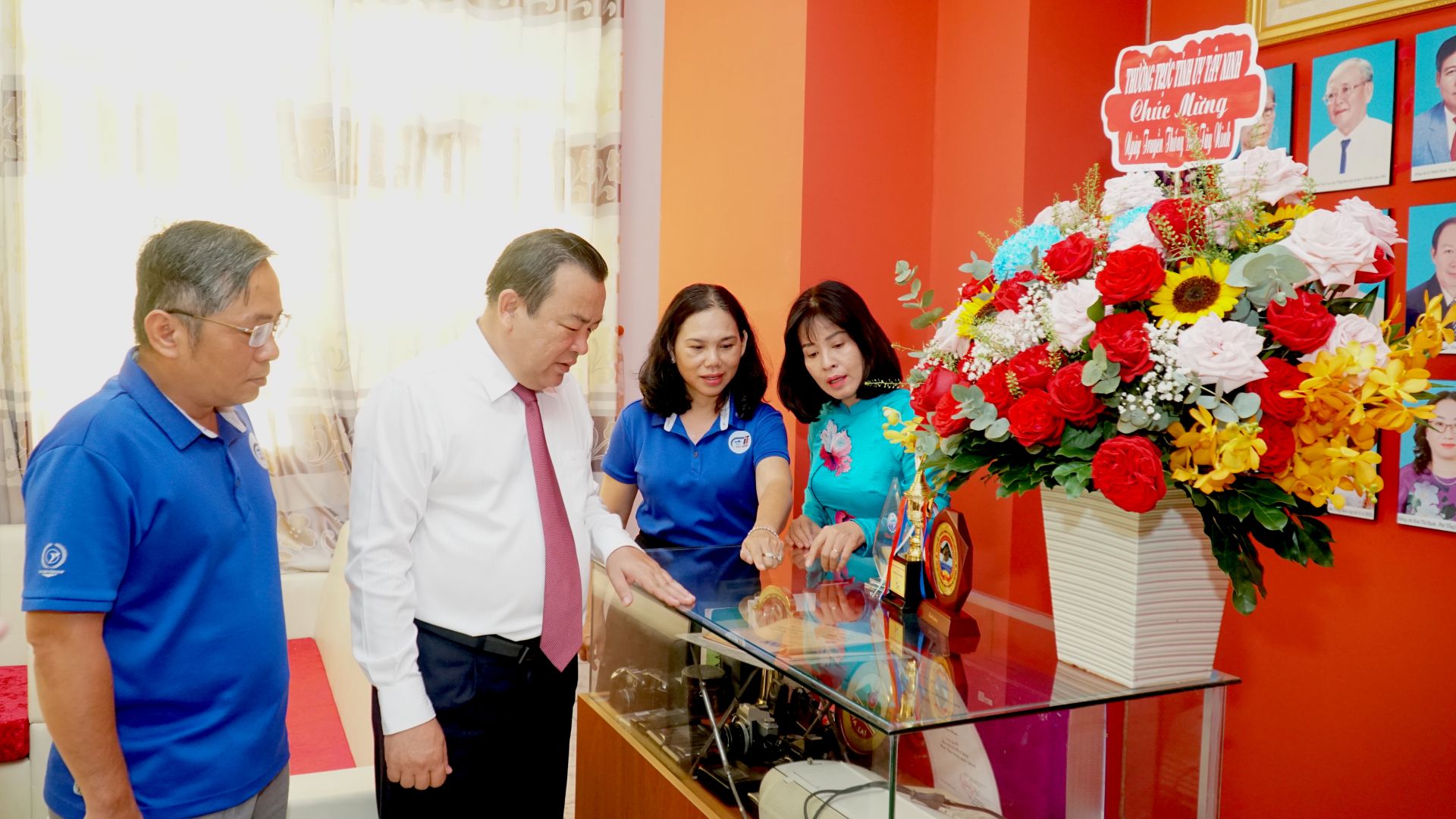 Phó Bí thư Thường trực Tỉnh uỷ Phạm Hùng Thái, bà Nguyễn Thị Xuân Hương- Trưởng Ban Tuyên giáo Tỉnh uỷ và Ban biên tập Báo Tây Ninh ôn lại những kỷ vật làm báo của các thế hệ cha anh qua 77 năm hình thành và phát triển.