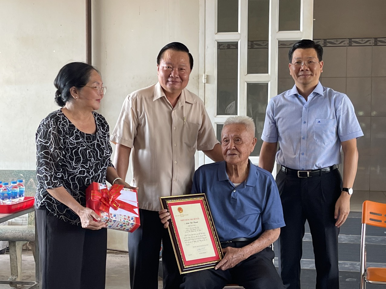 Đoàn đến thăm, trao thiếp mừng thọ, 5m vải lụa của Chủ tịch nước cho cụ Lâm Thế Thanh (phường Long Thành Trung) và cụ Đoàn Văn Lòng (phường Long Thành Bắc) tròn 100 tuổi; trao thiếp mừng thọ của Chủ tịch UBND tỉnh cho cụ Lưu Tấn Lộc (phường Long Thành Bắc); cụ Phùng Thị Hai (xã Trường Hoà) và cụ Trần Văn Tâm (xã Trường Đông) trên 100 tuổi.