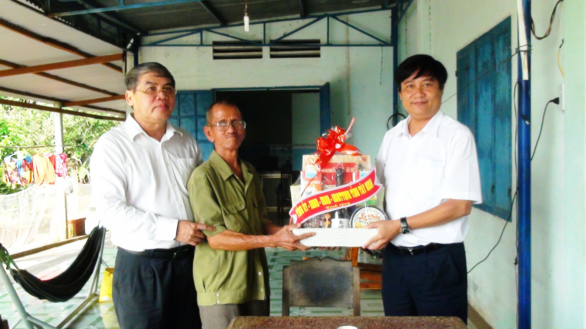 Phó Chủ tịch HĐND tỉnh Nguyễn Thanh Phong (bên trái) cùng Bí thư huyện uỷ Dương Minh Châu Nguyễn Hồng Sơn thăm, tặng quà cho ông Dương Hồng Đức, thương binh 1/4, hiện cư ngụ tại xã Cầu Khởi.