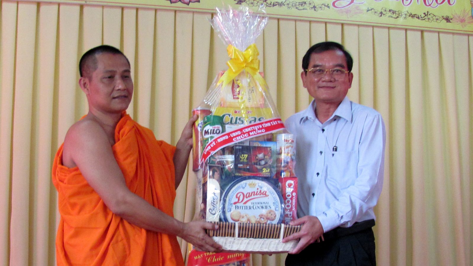 Phó Bí thư thường trực Tỉnh ủy Tây Ninh Nguyễn Minh Tân tặng quà đại diện chùa.