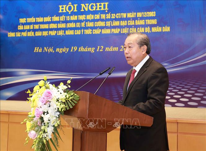 Đây là nhấn mạnh của Ủy viên Bộ Chính trị, Phó Thủ tướng Thường trực Trương Hòa Bình, Trưởng Ban Chỉ đạo Tổng kết Chỉ thị 32-CT/TW tại Hội nghị tổng kết 15 năm thực hiện Chỉ thị số 32-CT/TW ngày 9/12/2003 của Ban Bí thư về tăng cường sự lãnh đạo của Đảng trong công tác phổ biến, giáo dục pháp luật, nâng cao ý thức chấp hành pháp luật của cán bộ, nhân dân. Hội nghị được tổ chức sáng 19/12, tại Trụ sở Chính phủ.