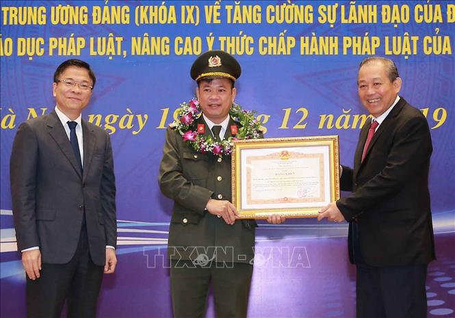 Phó Thủ tướng Thường trực Chính phủ Trương Hòa Bình và Bộ trưởng Bộ Tư pháp Lê Thành Long tặng Bằng khen của Thủ tướng Chính phủ cho các tập thể và cá nhân có thành tích xuất sắc trong thực hiện Chỉ thị số 32-CT/TW. Ảnh: Doãn Tấn/TTXVN