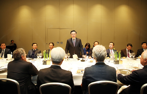 “Chính phủ Việt Nam sẽ tiếp tục thực hiện các chủ trương đổi mới thể chế kinh tế, hoàn thiện luật pháp để Việt Nam tiếp tục hội nhập sâu rộng hơn vào nền kinh tế thế giới, đưa Việt Nam phát triển nhanh, bền vững, thoát khỏi bẫy thu nhập trung bình”, Phó Thủ tướng Vương Đình Huệ cho biết.