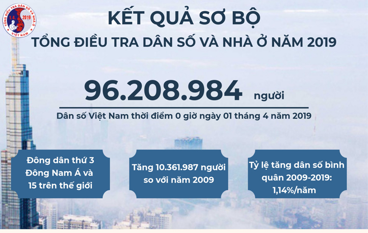 Sáng 11/7, Ban chỉ đạo Tổng điều tra dân số và nhà ở Trung ương công bố, dân số Việt Nam đến tháng 4/2019 là 96,2 triệu, đứng thứ ba khu vực Đông Nam Á, thứ 15 thế giới.