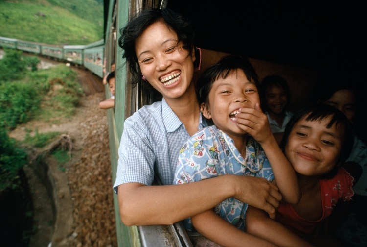 Cô gái Việt và đám trẻ vui đùa trên tàu Thống Nhất. Ảnh: Catherine Karnow.