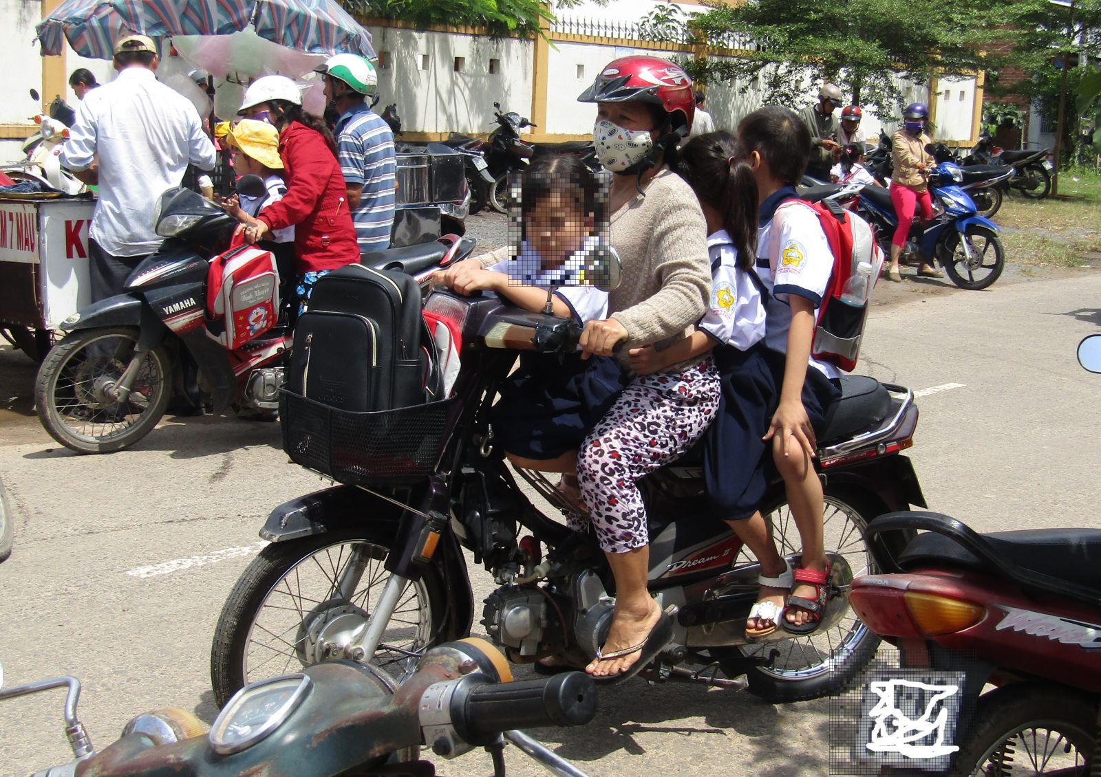 Phụ huynh chở cùng lúc nhiều trẻ nhưng không em nào đội MBH.