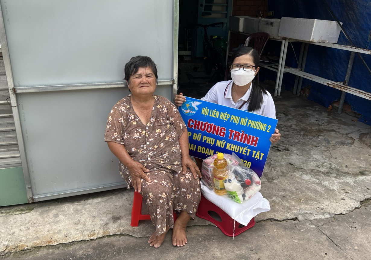 Chị Phan Thị Bích Thảo- Chủ tịch Hội LHPN phường 2 trao quà cho phụ nữ khuyết tật trên địa bàn phường.