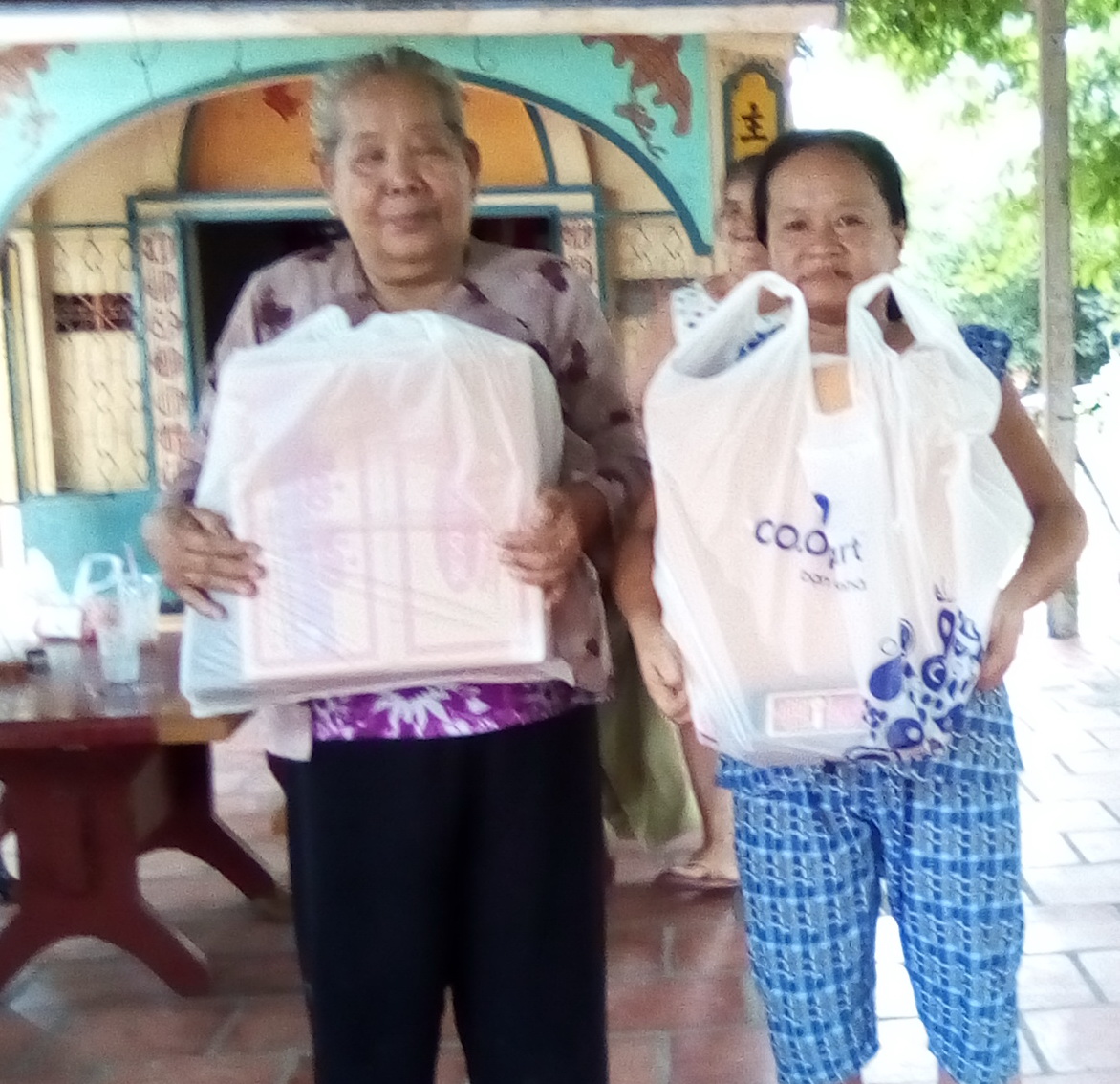 Mỗi phần quà trị giá 300 ngàn đồng, gồm gạo và một số nhu yếu phẩm, với tổng số tiền 30 triệu đồng do gia đình bà Nguyễn Thị Rẽ hỗ trợ.