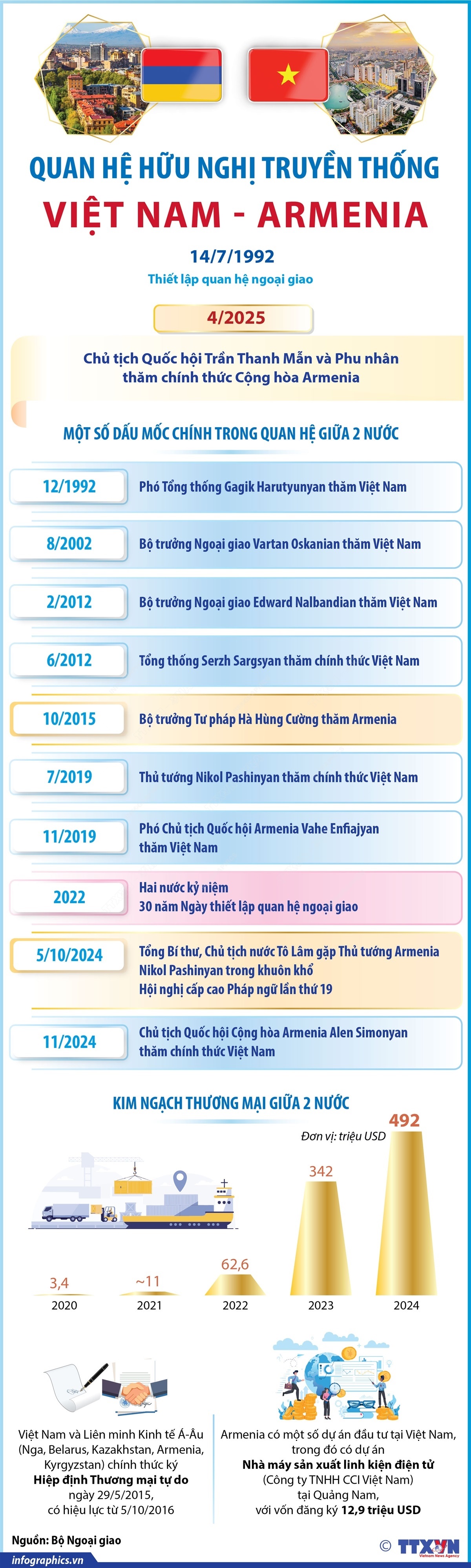 Trong chuyến công tác nước ngoài từ ngày 2 đến 8/4/2025, Chủ tịch Quốc hội Trần Thanh Mẫn và Phu nhân thăm chính thức Cộng hòa Armenia theo lời mời của Chủ tịch Quốc hội Armenia Alen Simonyan.