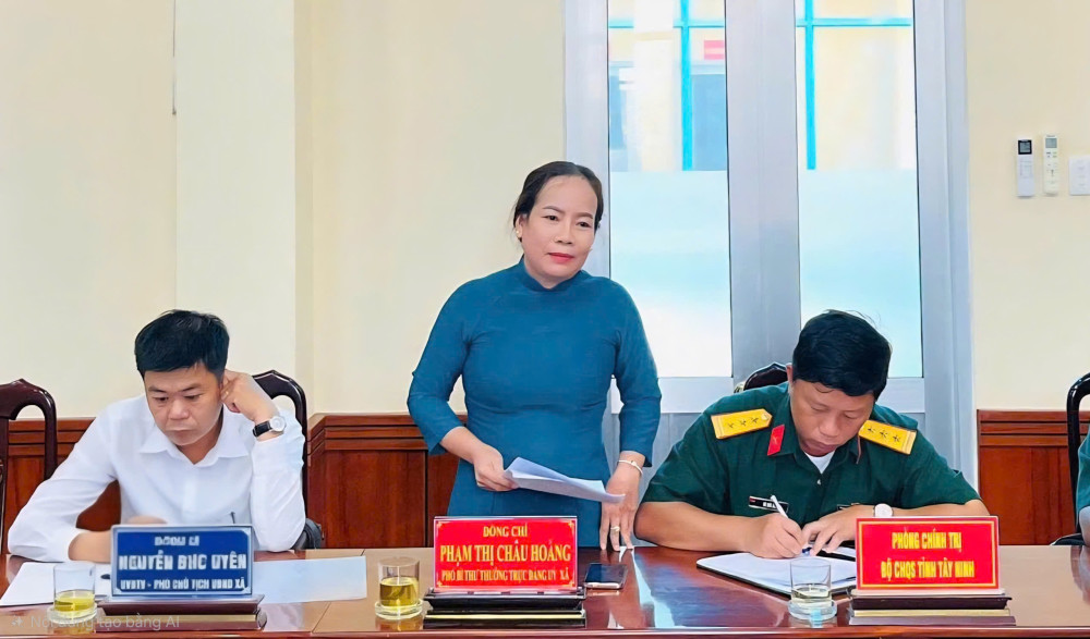 Cùng đi có Thượng tá Ngô Khánh – Phó Chính ủy Bộ Chỉ huy Quân sự tỉnh Tây Ninh. Tiếp và làm việc với Đoàn có Phó Bí thư Thường trực Đảng ủy xã Phạm Thị Châu Hoàng; Phó Chủ tịch UBND xã Trần Đăng Khoa.