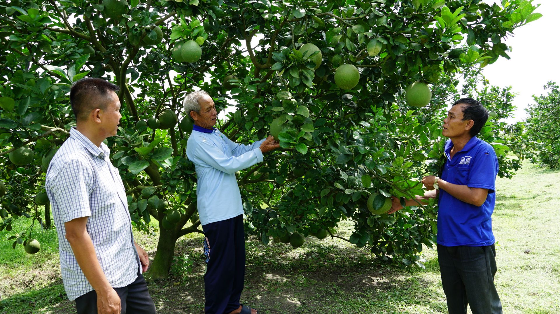 Nông dân trao đổi kinh nghiệm trồng bưởi da xanh trên địa bàn xã Truông Mít, huyện Dương Minh Châu.