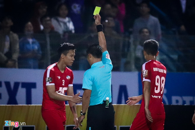 Quế Ngọc Hải nhận thẻ vàng sau pha vào bóng. Ảnh: Minh Chiến.