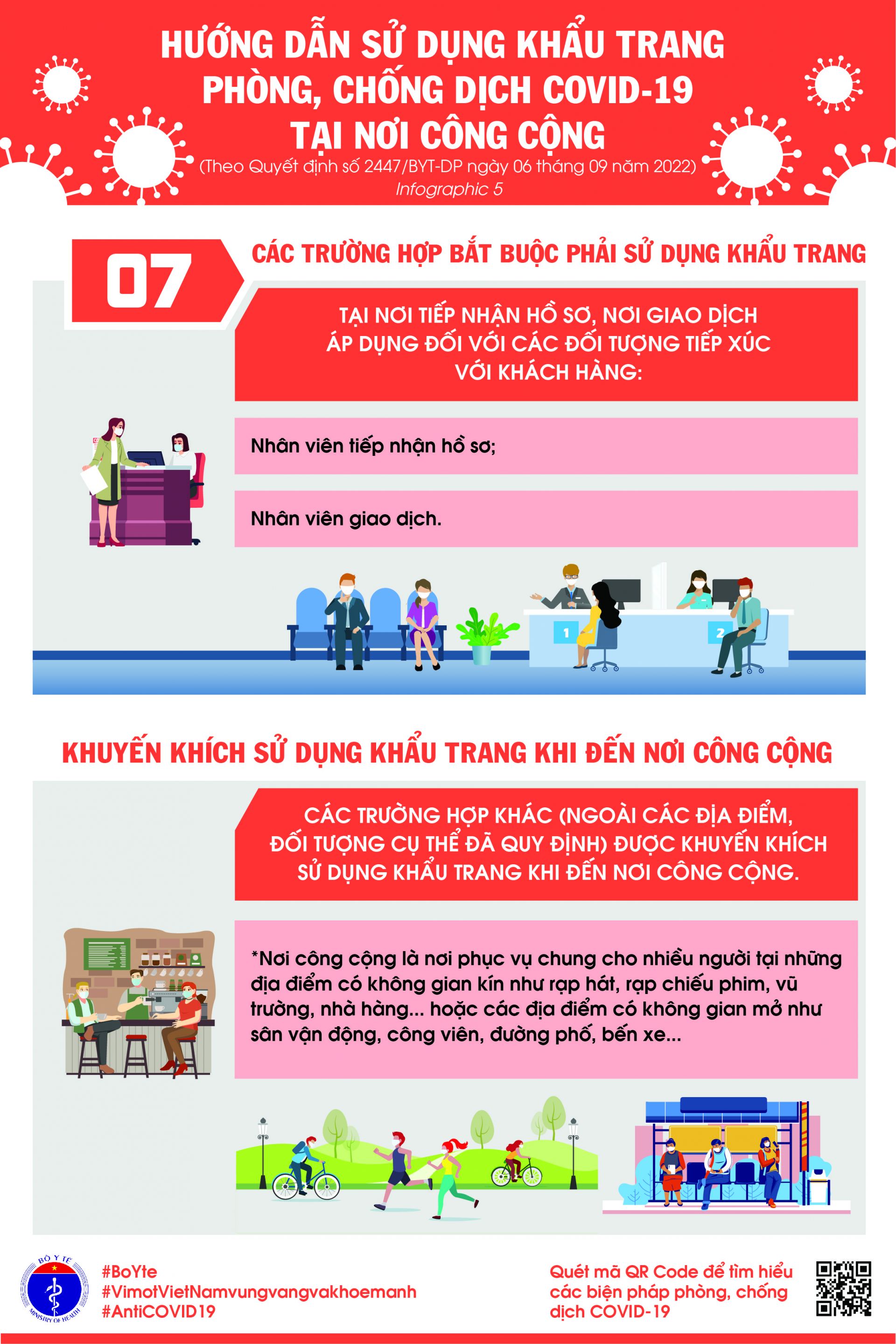 Bộ Y tế vừa ban hành hướng dẫn sử dụng khẩu trang nơi công cộng, đồng thời chỉ rõ một số đối tượng, địa điểm bắt buộc phải đeo khẩu trang tại Quyết định số 2447/QĐ-BYT ngày 6.9.2022.