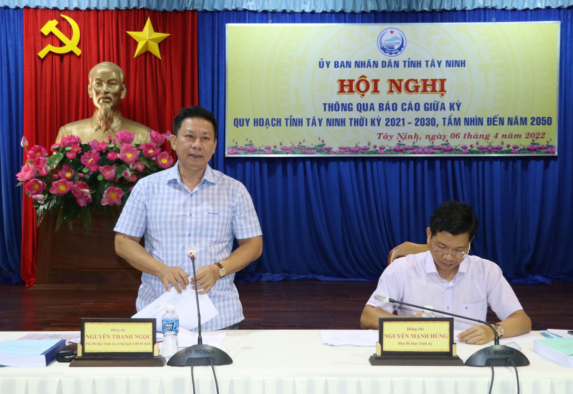Phát biểu tại hội nghị, Chủ tịch UBND tỉnh Nguyễn Thanh Ngọc cho rằng, báo cáo đã gợi mở định hướng phát triển cho Tây Ninh trong thời gian tới, Ban chỉ đạo tỉnh cơ bản thống nhất với báo cáo giữa kỳ của đơn vị tư vấn, nhất là về định hướng không gian phát triển, các vùng-trục phát triển đã bám sát quy định, trình tự thực hiện quy hoạch, nhiệm vụ lập quy hoạch, có tính khoa học, sát tình hình thực tế của địa phương.