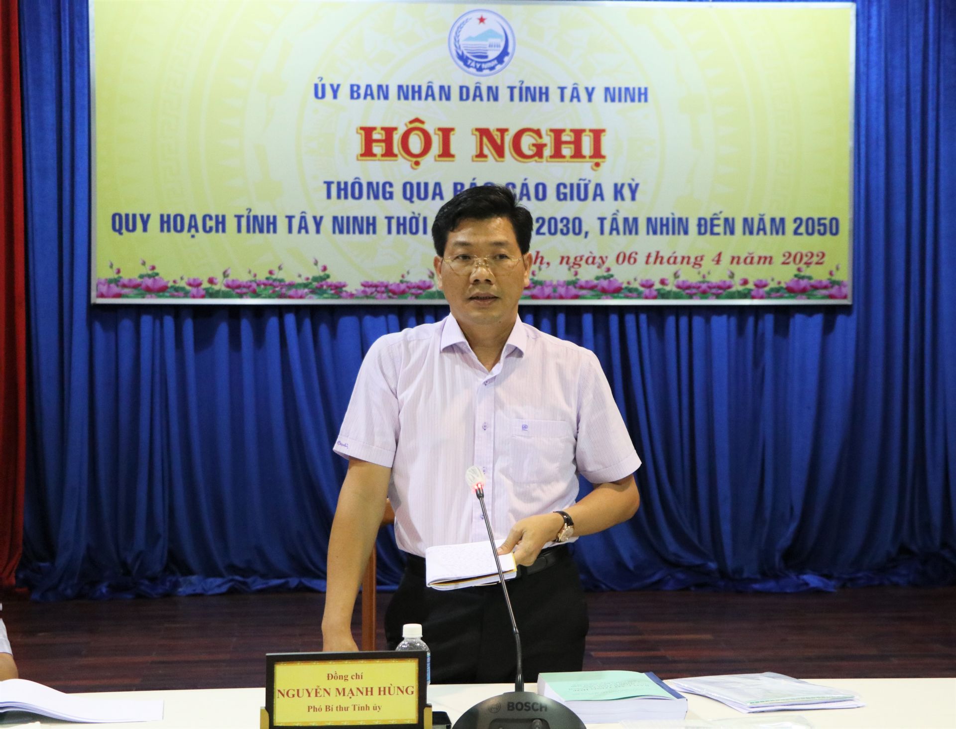Phó Bí thư Tỉnh uỷ Nguyễn Mạnh Hùng cơ bản thống nhất với báo cáo giữa kỳ lần này, đặc biệt là báo cáo đã thể hiện được các quan điểm, định hướng lãnh đạo, chỉ đạo của lãnh đạo tỉnh và các sở, ngành. Tuy nhiên, đơn vị tư vấn cần xem lại mục tiêu phát triển và một số giải pháp đặt ra. Trong 3 kịch bản đưa ra, đơn vị tư vấn chưa định hướng tỉnh nên theo kịch bản nào. Các giải pháp đột phá cần được thể hiện rõ hơn.